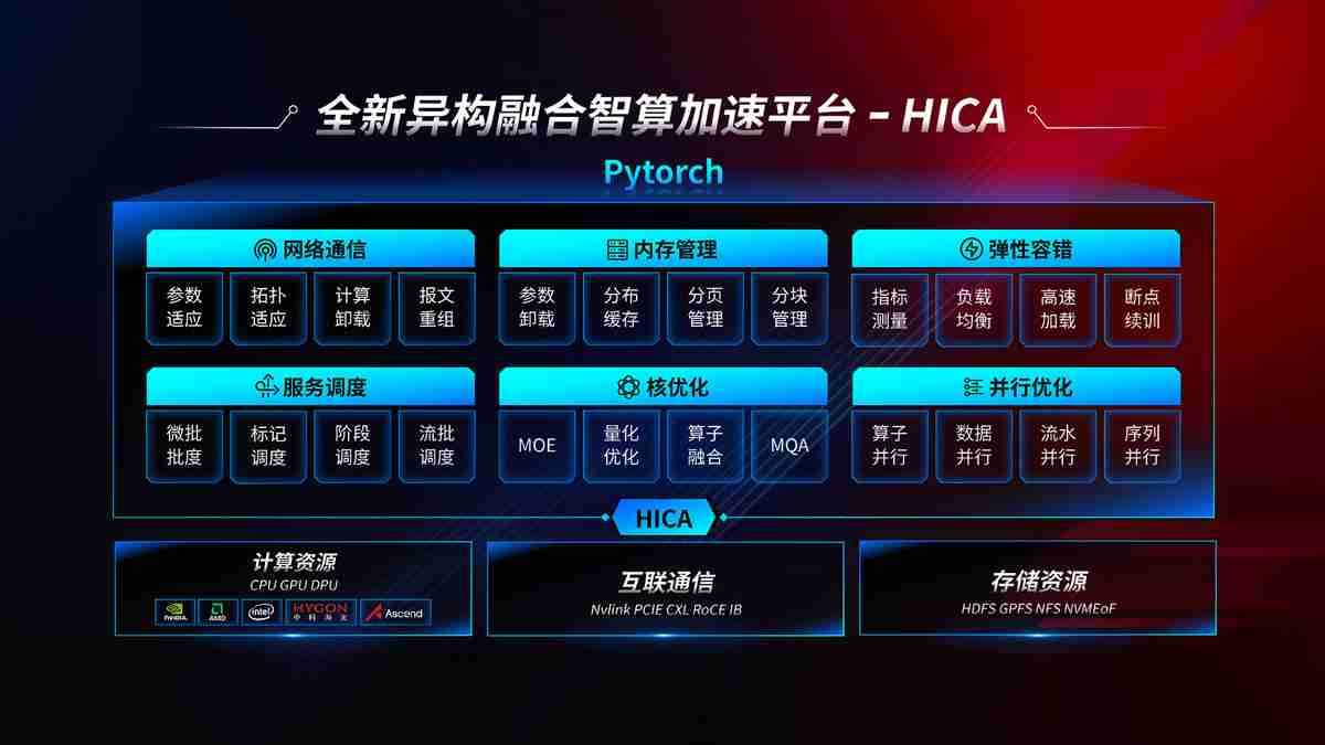 通过自研的服务层、、中间适配层、、、以及调度编排算法,,,,采用数据并行、、、模型并行等多种并行方式,,把并行计算任务进行有效的分解,,,,使其分别由相应的软件栈和算力资源来承接。。。当GPU资源变化,,HICA可以实时动态调度计算子任务并调整模型拓扑和架构,,,以充分聚合各种算力资源。。。。