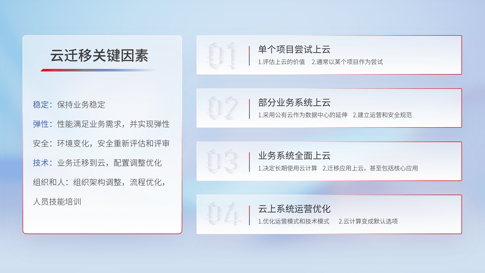 结合实际业务,,,从规划设计、、、云平台选型、、云原生改造、、数据迁移、、集成交付,,迁移全过程为客户识别最佳上云路径,,,,做好风险识别管理,,,设计网络架构、、、、身份权限、、、安全审计合规、、、操作审计、、、日志审计、、、监控告警策略、、、、多站点容灾设计等,,,,对云上基础设施进行整体规划,,,,提升IT治理水平,,,,以满足弹性、、高可用、、、高性能的需求。。。。