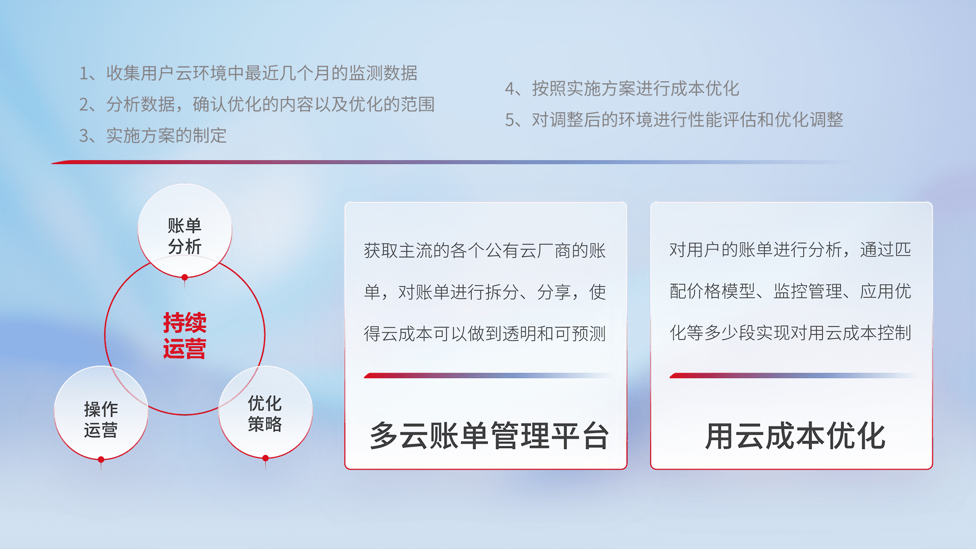 通过多云纳管,,,,以统一的资源数据模型把客户的云资源进行抽象和封装,,,,进而实现对多云资源的统一操作,,保障云资源管理的可靠性、、稳定性与可用性。。。。量身定制化运维内容,,配置、、开发运维、、、补丁管理、、备份、、监控、、认证和访问管理、、、、审计和日常巡检等,,保障在用云过程中的可靠度,,,,稳定度以及高可用率。。。