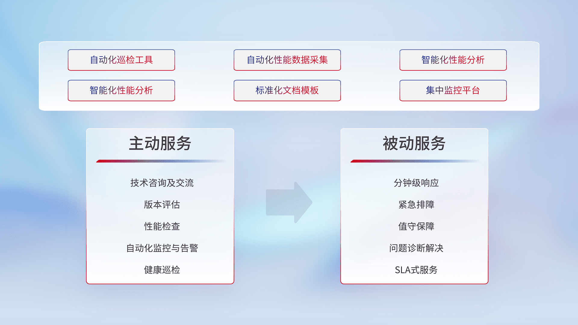 智能化工具和标准化文档,,保障服务质量,,提供主动服务(包含技术咨询、、版本评估、、、性能检查、、、、自动化监控与告警、、、、健康巡检)和被动服务包含(分钟级响应、、、紧急排障、、、值守保障、、、问题诊断解决、、、、SLA服务)。。